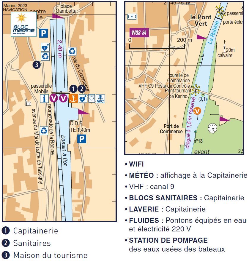 Un ponton d’attente, non relié à la terre, en aval du pont de Kérino vous permet de vous amarrer jusqu’à la prochaine ouverture du bassin.